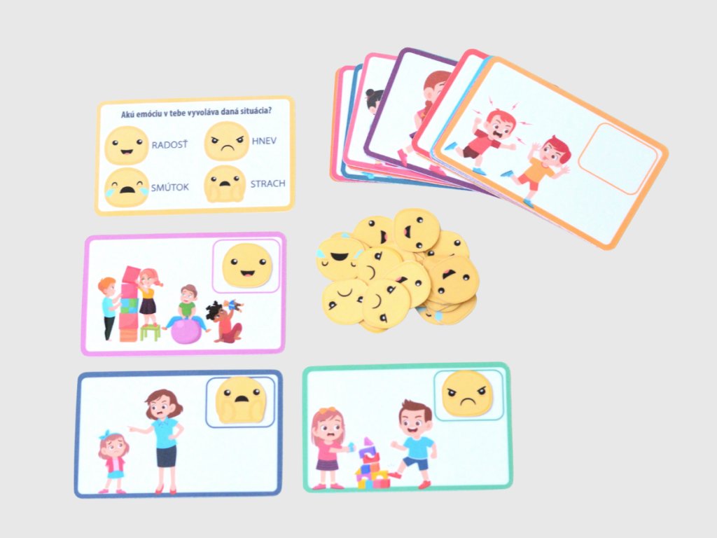 Situácie a pocity – kartičky s rôznymi situáciami, kde dieťa dopĺňa smajlíkov (strach, úsmev, plač, hnev).