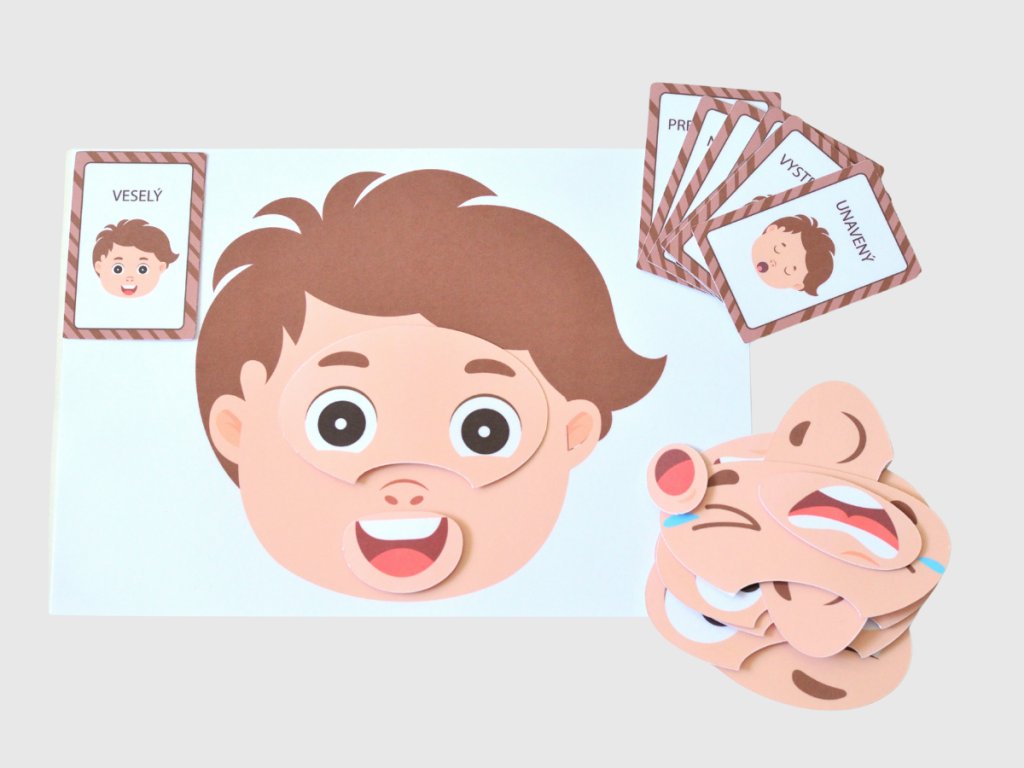 Meniace sa tváričky – dopĺňanie emócií na chlapčeka podľa kartičiek (oči, ústa).