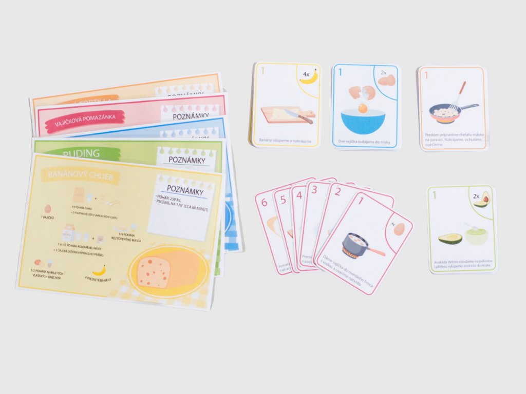 Táto malá krabička receptov pre deti (verzia1) obsahuje základnú sadu 5 jednoduchých, obrázkových receptov pripravených špeciálne pre malých kuchárov: