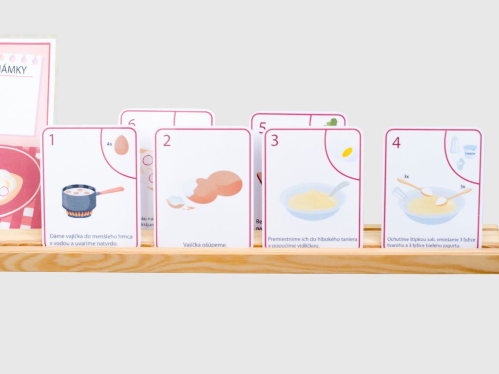 Navyše si môžete dokúpiť aj drevenú latu, do ktorej si deti recepty pekne zasunú podľa poradia a majú ich prehľadne pripravené pri varení.