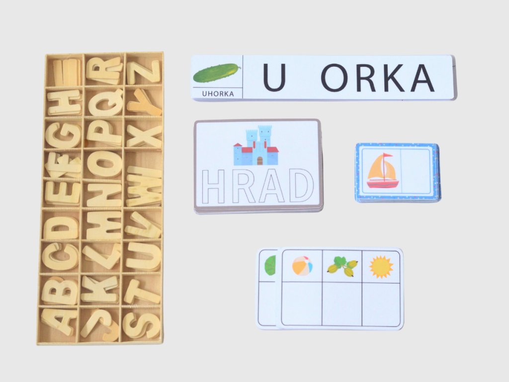 Prikladanie písmen na kartičky podľa obrysov a skladanie jednoduchých slov (16 kartičiek).