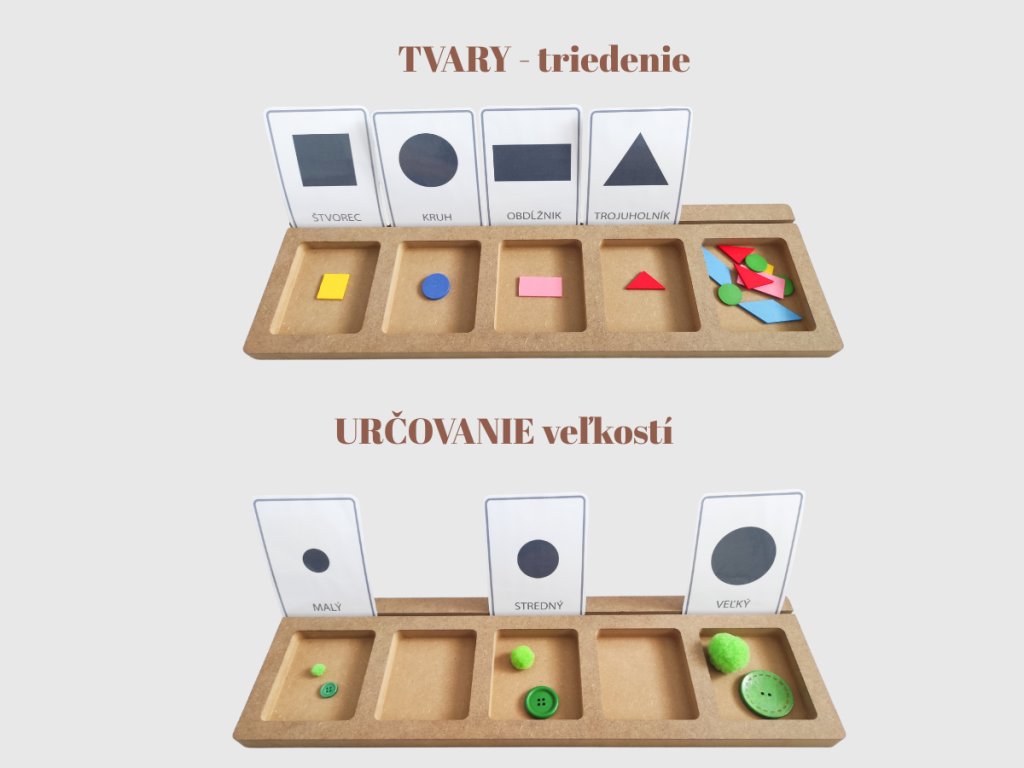 🔺 Tvary (8 kartičiek) – triedenie drevených tvarov alebo hľadanie predmetov v izbe s daným tvarom.