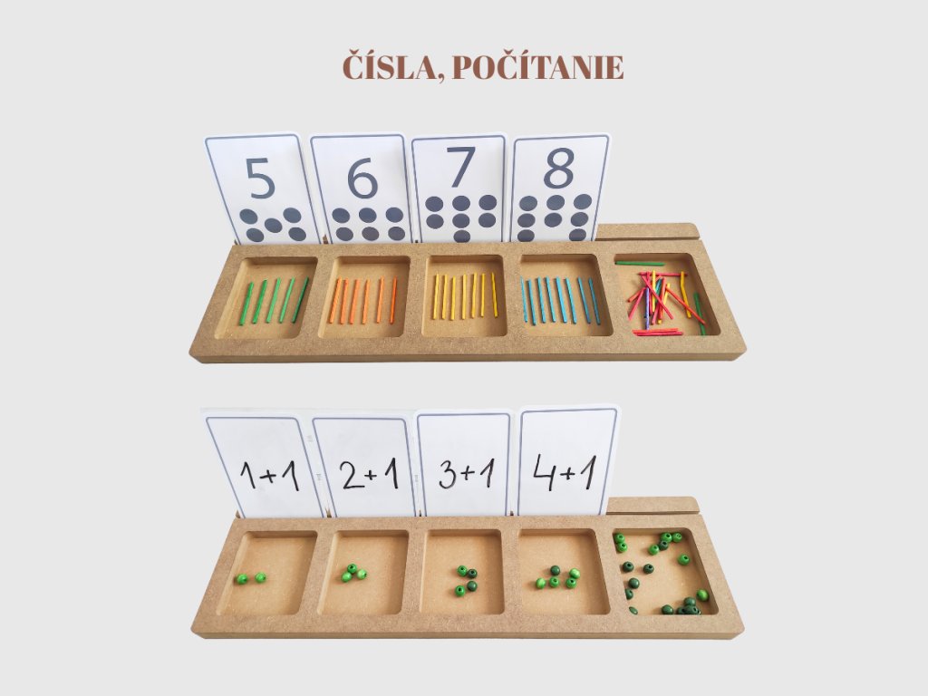 🔢 Čísla (12 kartičiek) – dopĺňanie množstva do priehradok (napr. 3 paličky, 4 guličky, 5 korálok).
