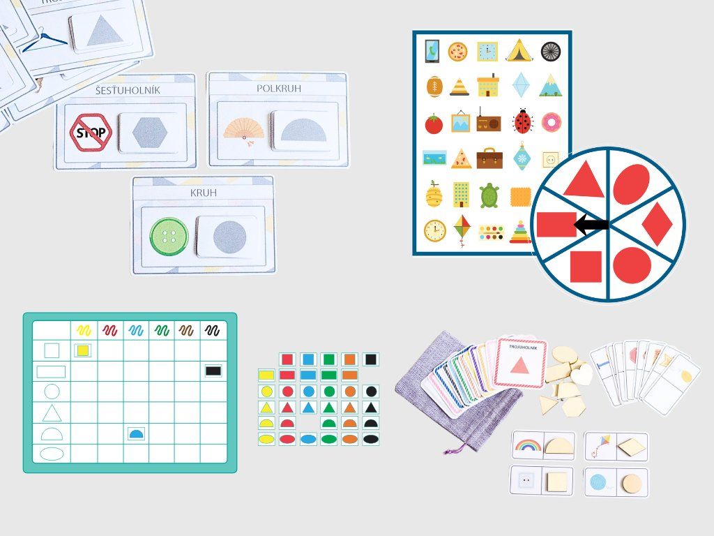 Deti najskôr priraďujú drevené tvary ku kartičkám, neskôr určujú tvar podľa predmetu (napr. melón – polkruh, okno – štvorec).